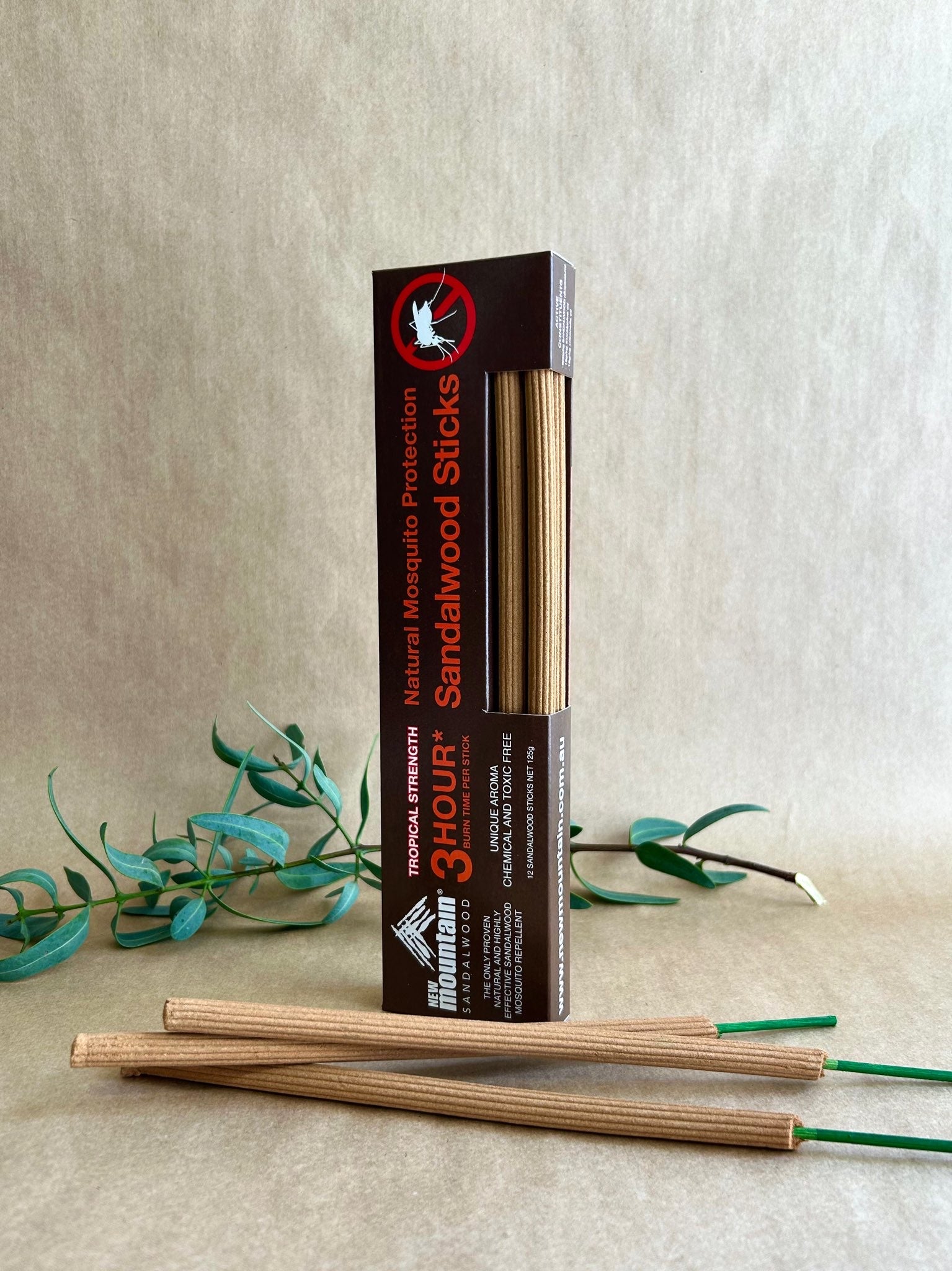 The Sandalwood used in New Mountain Mosquito sticks is from wild sandalwood that has naturally died. No chemicals, DEET or DEP. Safe to use around children and pets.